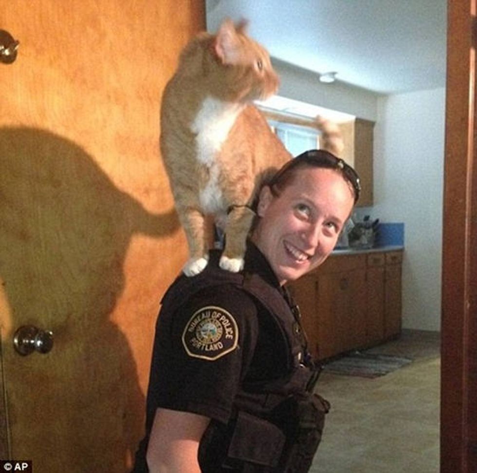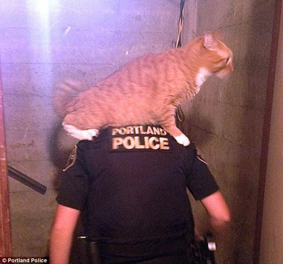 A ginger cat decided to help a Portland police officer look for clues by standing on her shoulders during a burglary investigation.