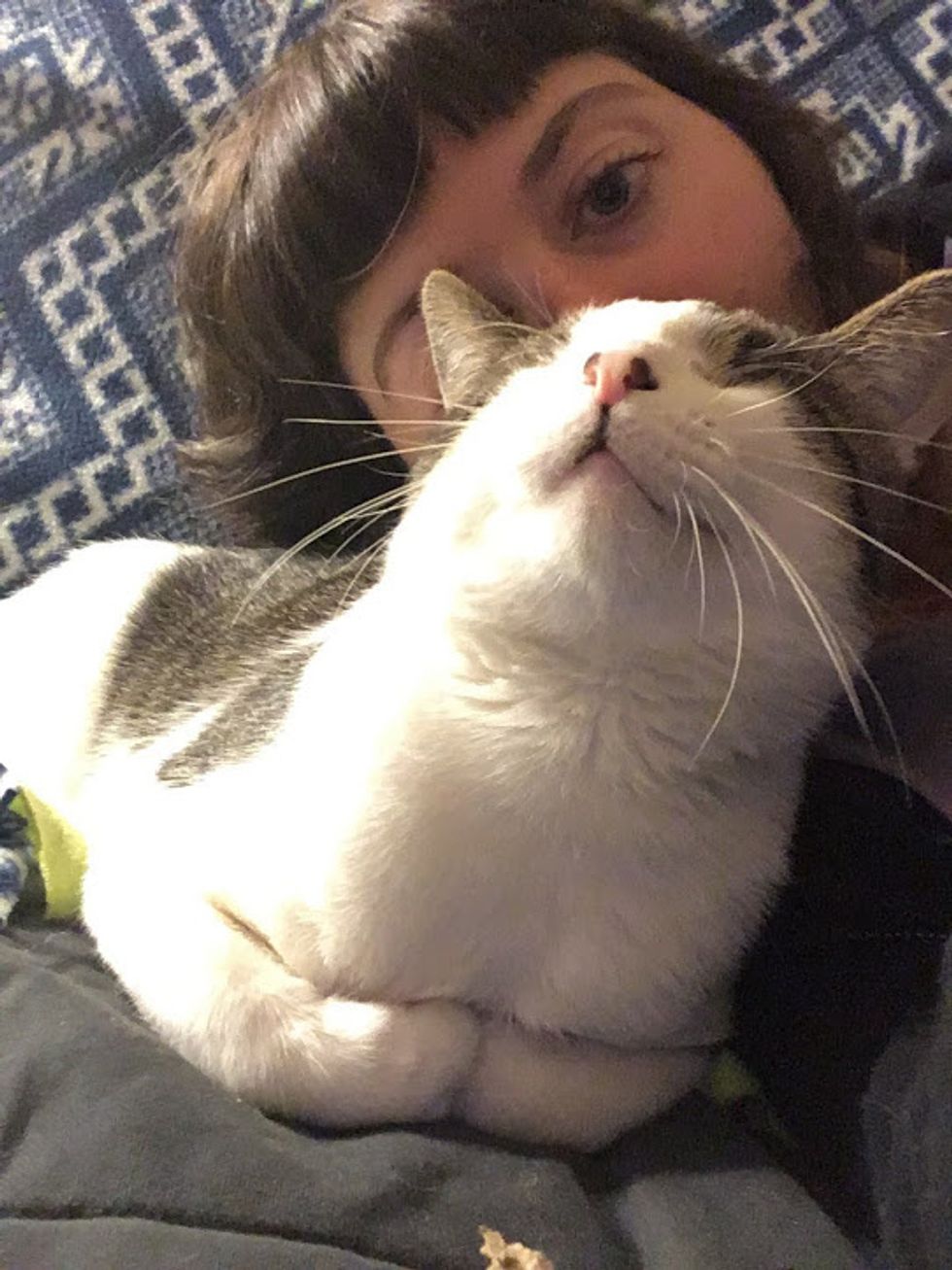 After his eye surgery, Samantha Bell DiGenova, cat behavior and enrichment lead of Best Friends, took Melvin home to foster. She helped him learn to adjust to living indoors.
