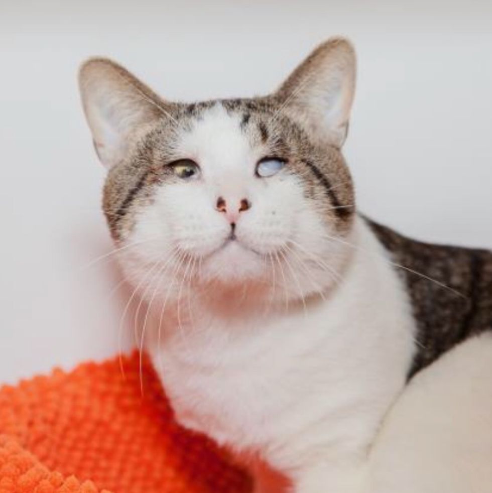 A few months ago, Melvin was rescued from a city shelter in Los Angeles and transferred to the Best Friends Pet Adoption Center for a second chance at life. The sweet 3-year-old cat was born with a condition called microphthalmia, in which the eyeball is smaller than normal.