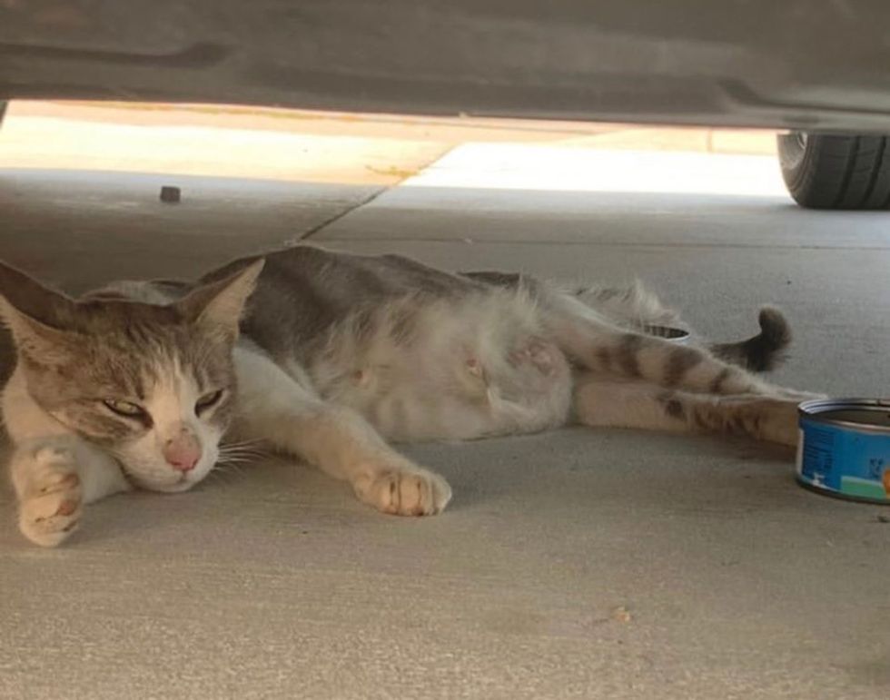 A stray cat showed up in a neighborhood of Moreno Valley, California, scrounging for food. She wandered into a family's backyard where she was offered a nice meal to fill her belly.