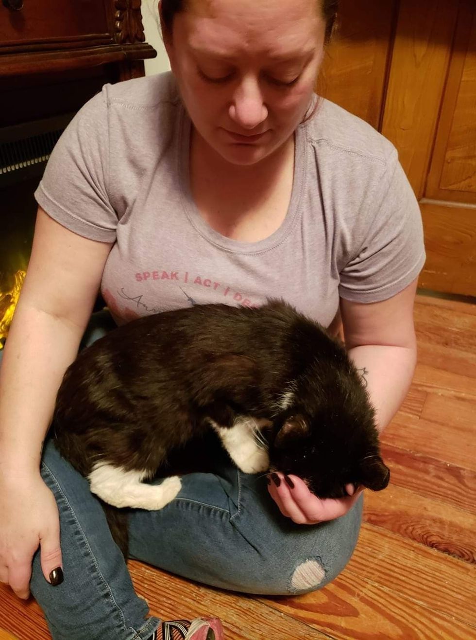 "She stayed like that for about ten minutes then snuggled down into my lap. She reminds me so much of my Minnie, with a little more cattitude."