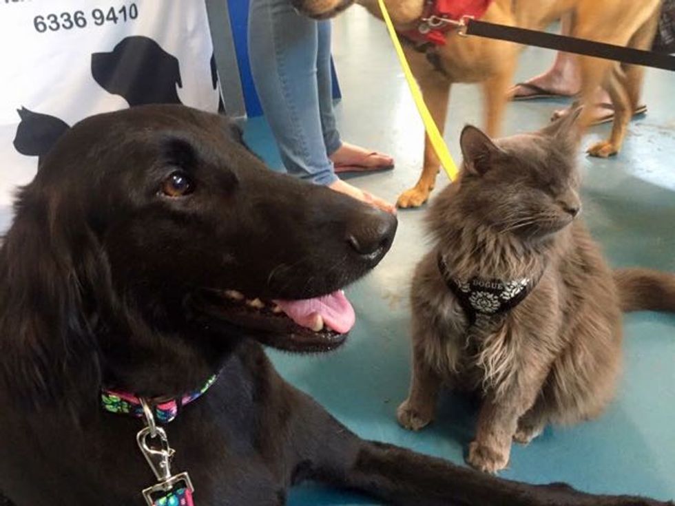 The blind cat extraordinaire hangs out with all the dogs like a boss.