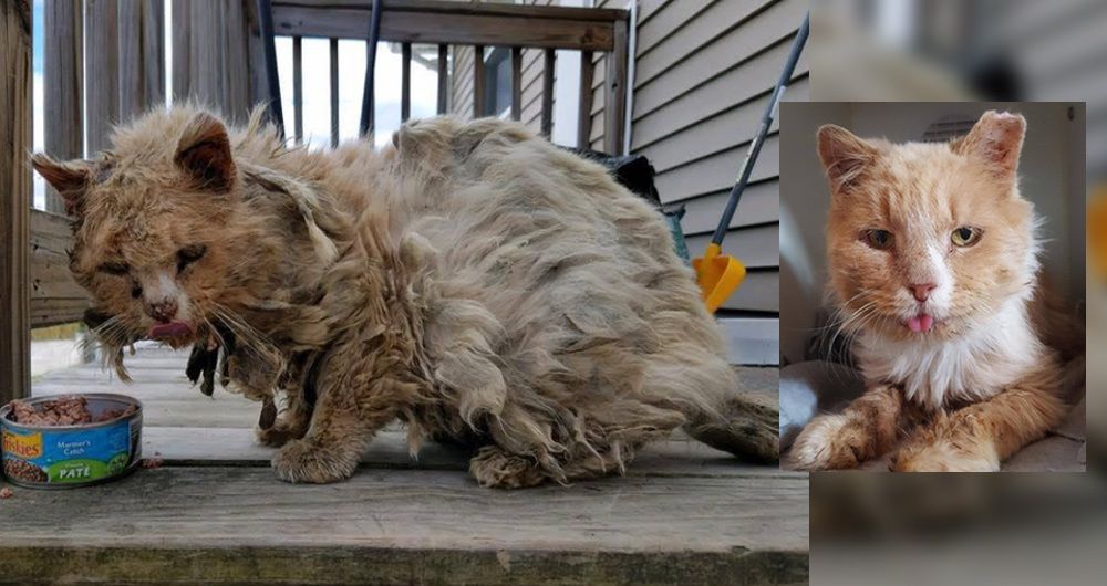 A disheveled stray cat was found wandering outside carrying a lot of matted fur on his back. With food, a shave and lots of TLC, he completely transformed!