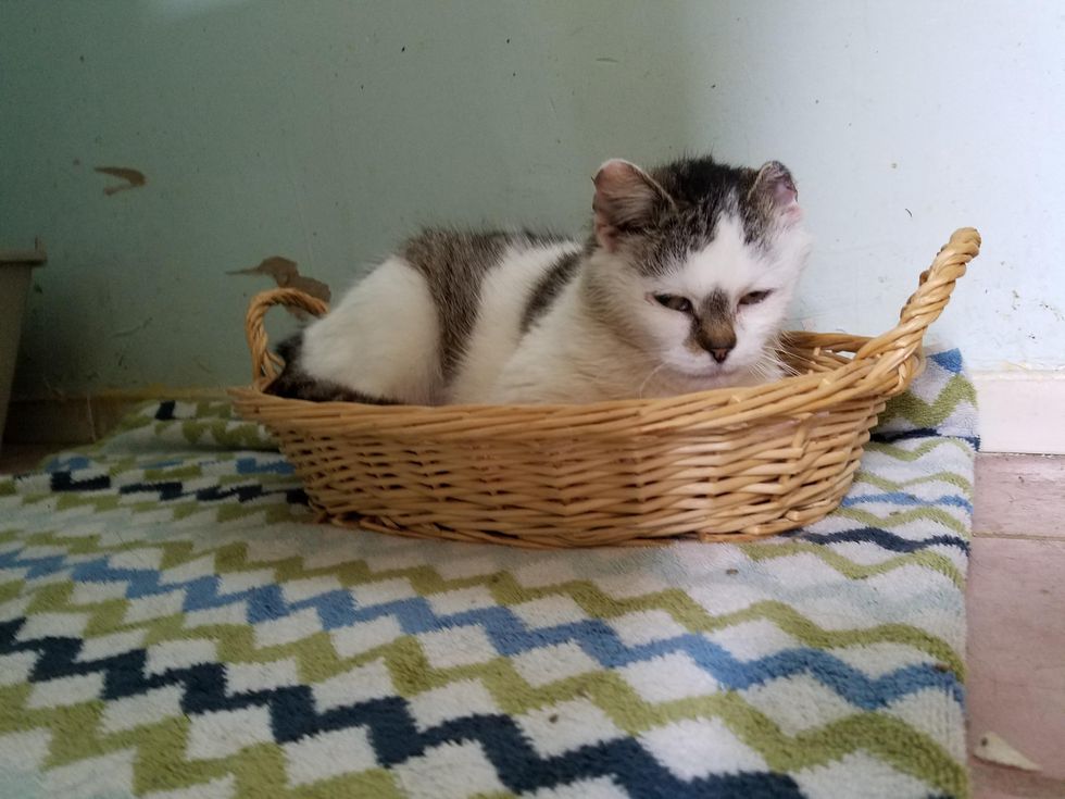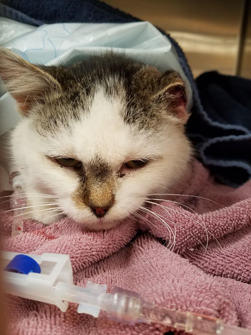 The vet discovered that the cat was pregnant, had no teeth, and her left ear flap was unsalvageable and needed to be surgically removed. She had injury in her chest and was breathing heavily due to a raging upper respiratory infection.