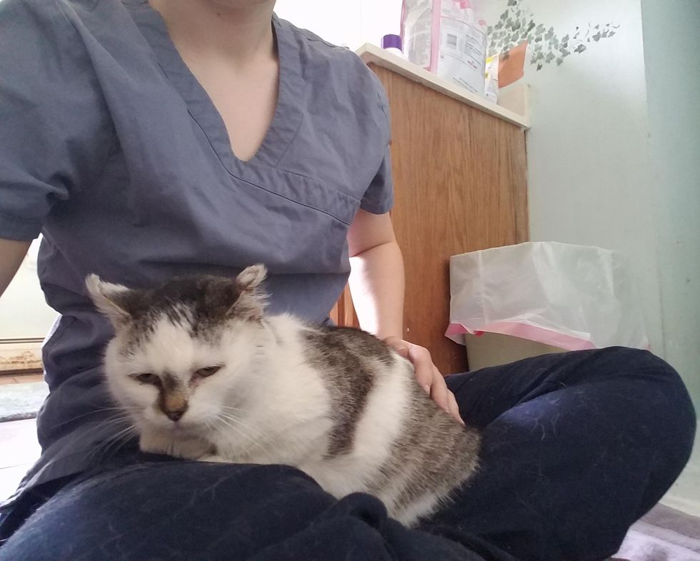 A cat was found outside a Bagel shop in need of a lot of TLC. A woman brought her home, and the kitty snuggled up to her, purring up a storm.