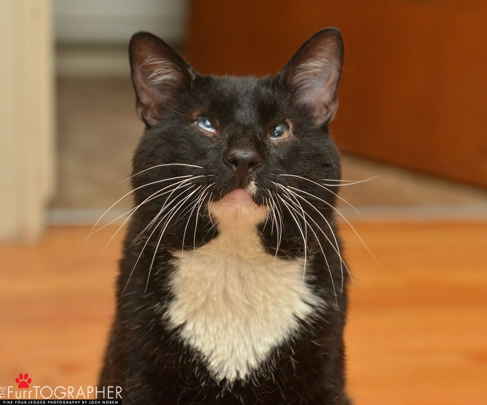 The tuxedo cat was born with eyelid agenesis, which means he is missing his upper eyelids. He also had a severe limp and an enlarged heart.