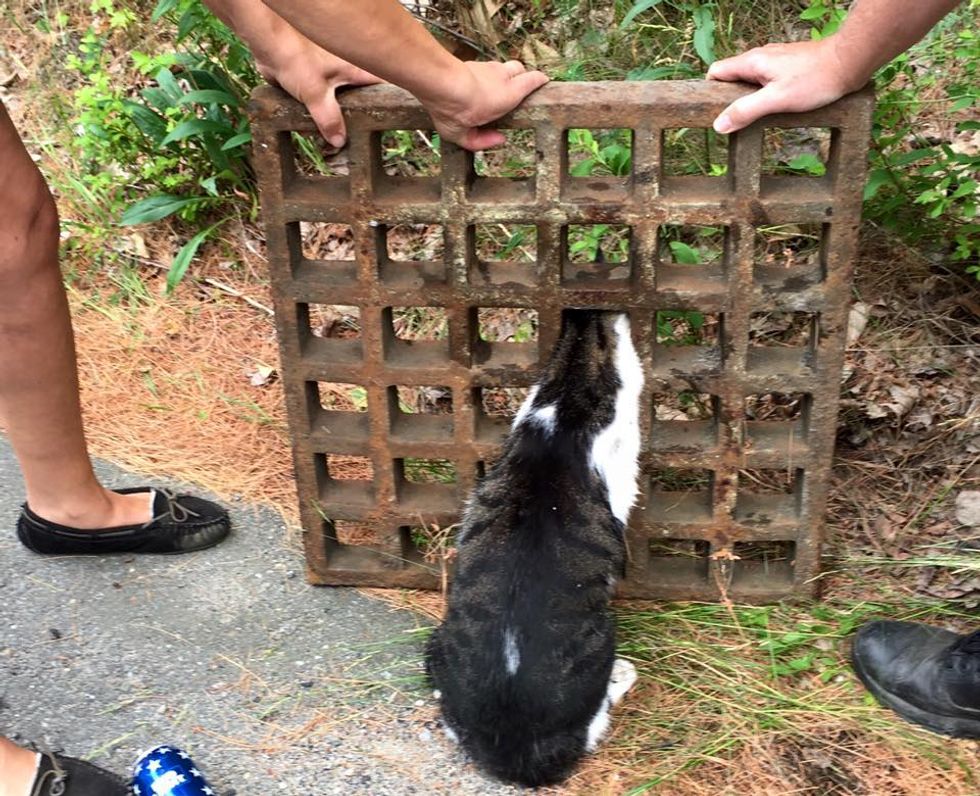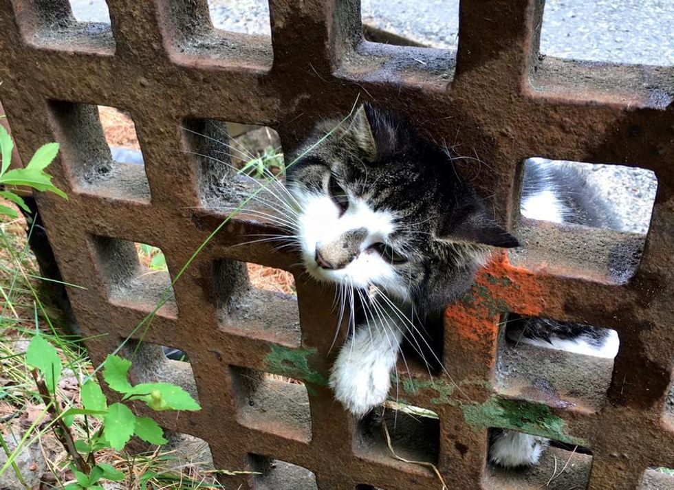 A one-year-old cat got herself in a pickle. She crawled into a storm drain to explore, but as she tried to exit, her head became wedged in the grate.