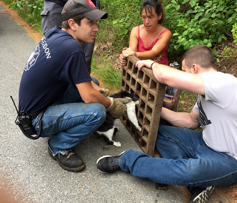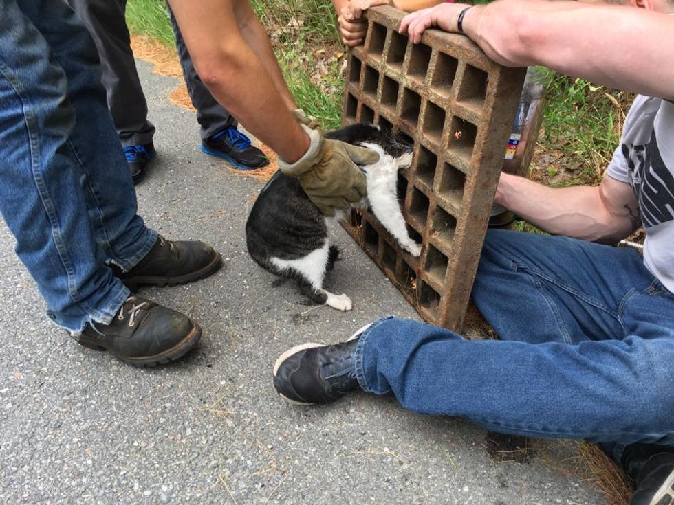 "We applied it around the cat's neck, we slowly worked (her) head back into the grate and within a couple minutes we freed the cat."
