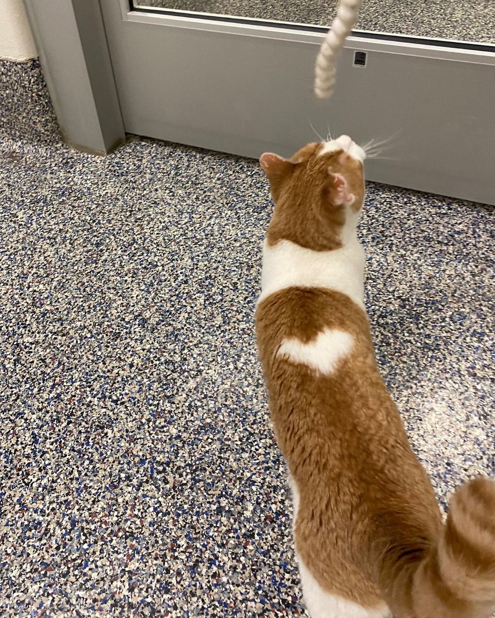 He has transformed into a happy and healthy cat who doesn't want to miss any opportunity to be doted on. As soon as he spots a moving toy, he takes off, chasing after it.