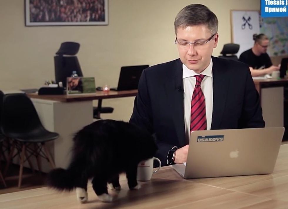 Mayor Nils Usakovs was taking part in an online segment when he was abruptly interrupted by a feline guest.