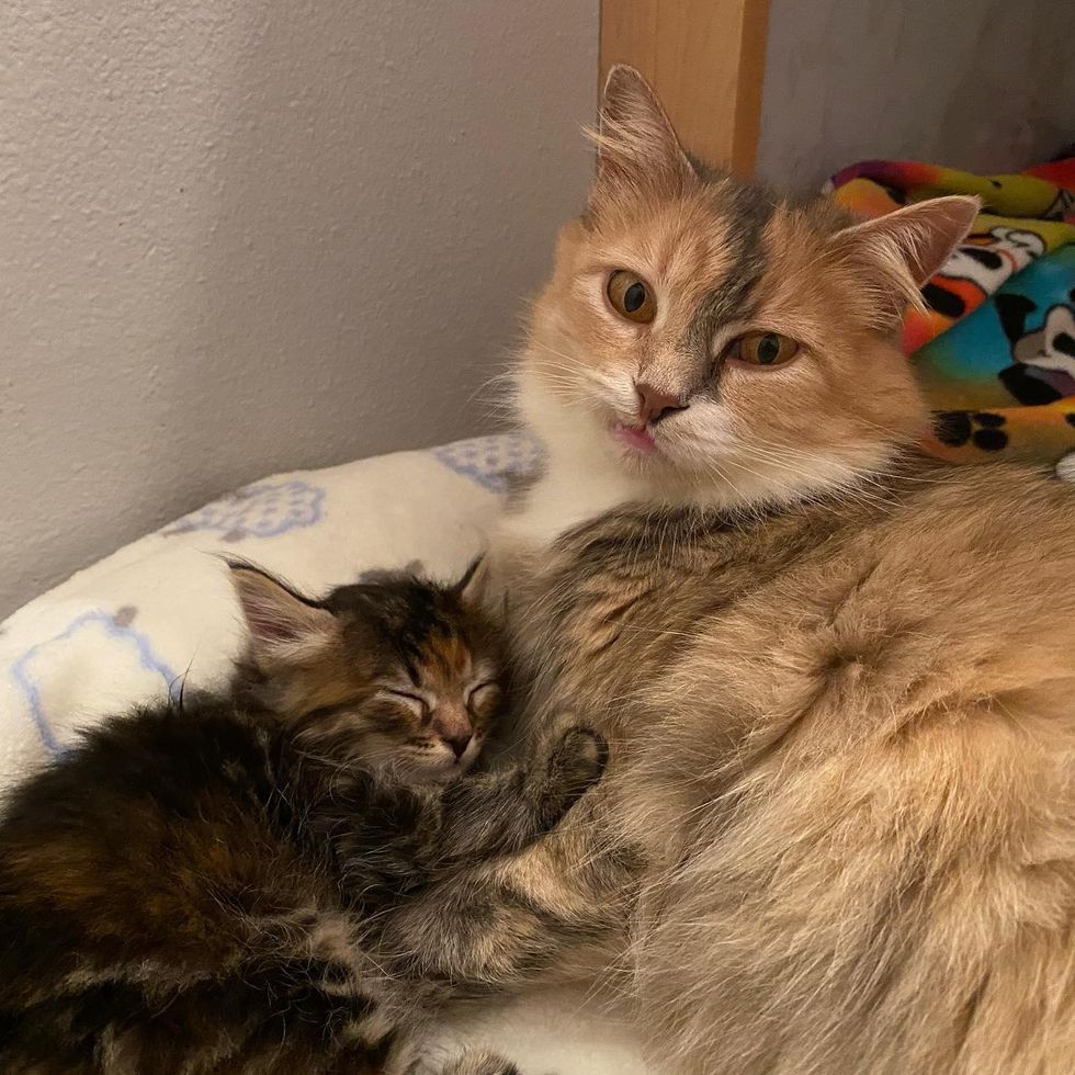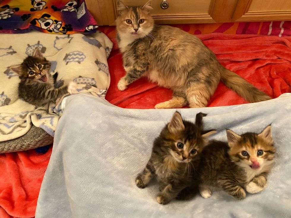 After getting treated for a few health issues, the sweet cat mom lay happily with her kittens in their clean, warm nest, purring up a storm. "She was such a good mom. She was always so happy and sweet."