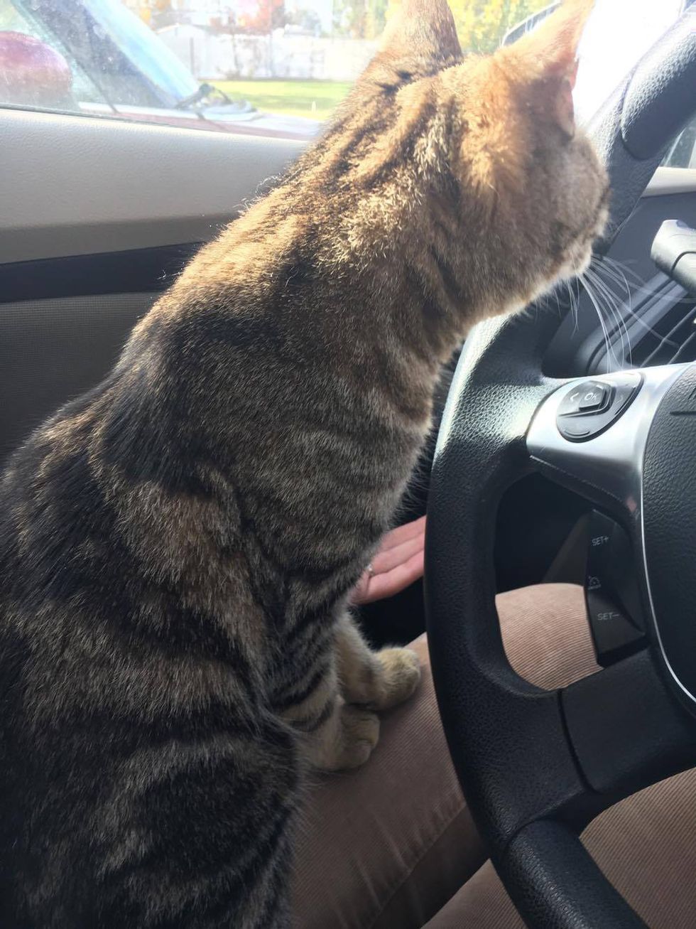 The sweet tabby proceeded to rub her face all over her human friend and the steering wheel, and then nuzzled her way into her arms and onto her shoulders as if she was so glad that she'd found her.