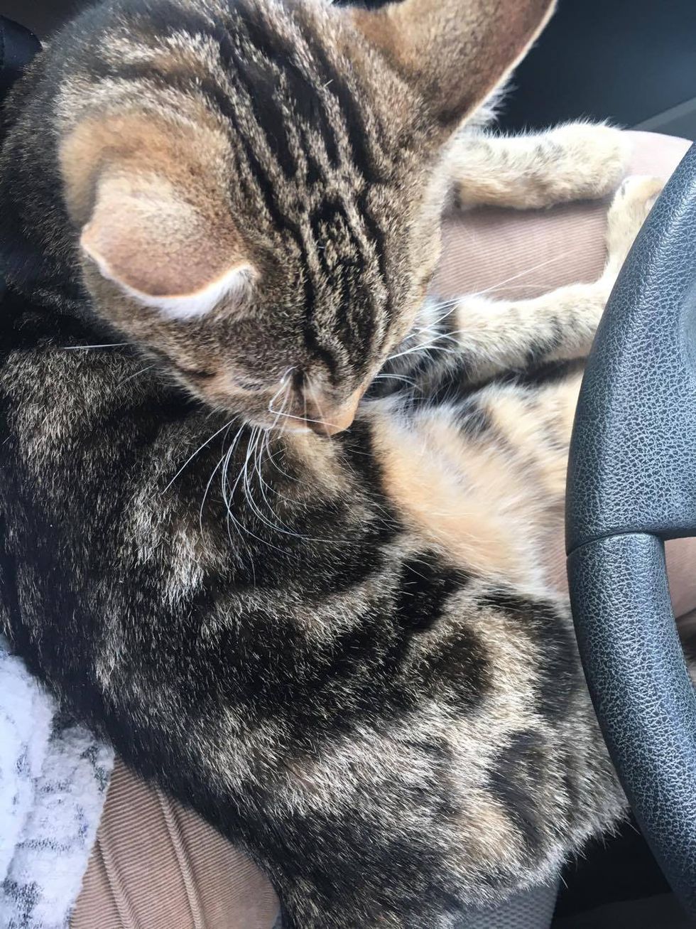 Surprised by the little unexpected feline, Susannah couldn't help but smile when the kitty nonchalantly made herself comfortable in her car.