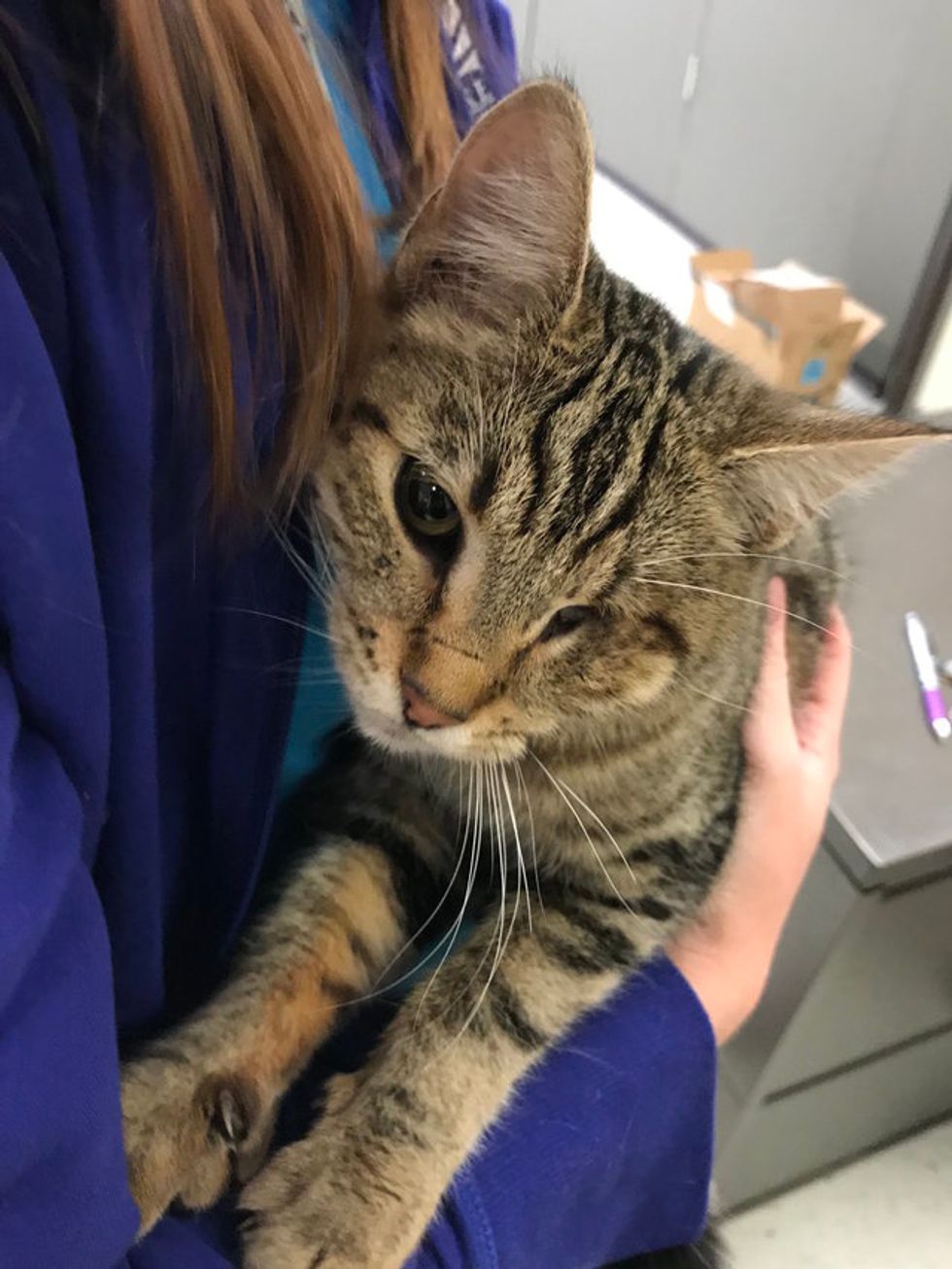 Despite her allergies, Susannah didn't mind the snuggles and was happy to be there at the right time. "It was clear to me that one of her eyes needed medical attention, but she was so cheery and friendly — she was purring the whole time," Susannah told Love Meow.