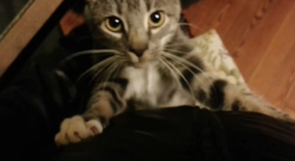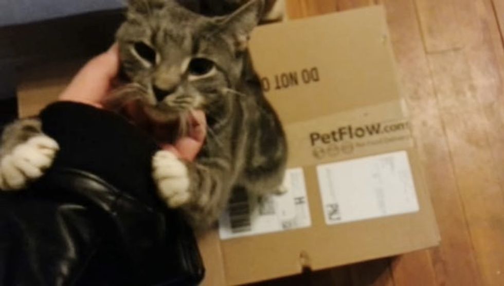 "My cat keeps hugging me and won't let me leave for work," YouTuber Voujdjr said.