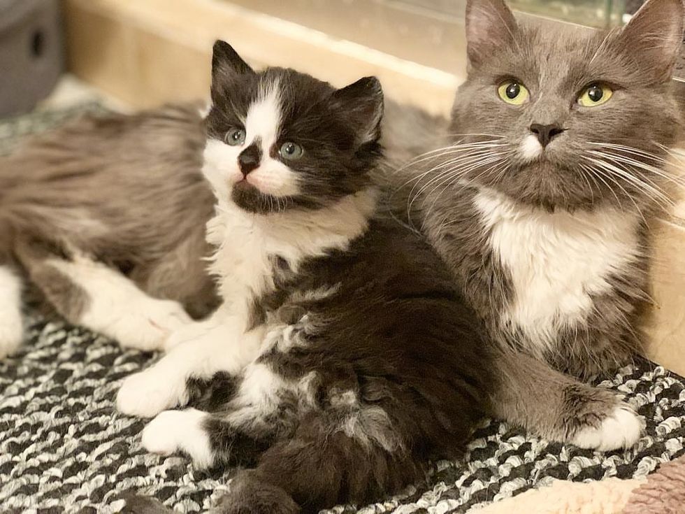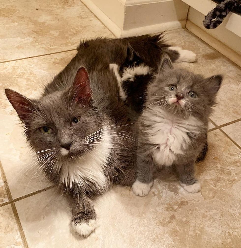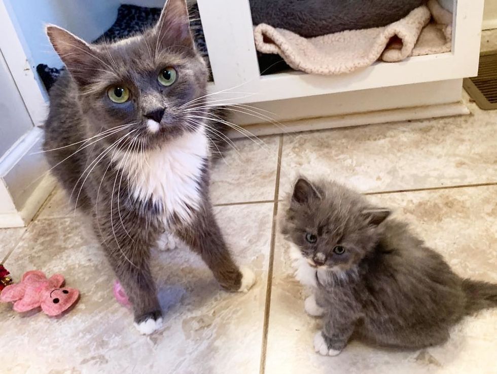 Georgia the little grey kitten is Mama Delta's tiny mini-me.