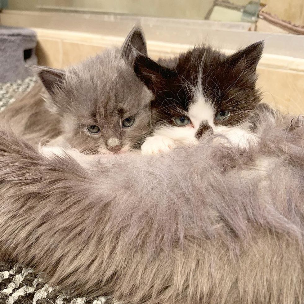 They were found covered in fleas, dirt and ear mites. The cat mother was just skin and bones and starving. She had used all her resources to feed, care for her kittens, keep them warm, and help them survive the harsh elements of the outdoors.