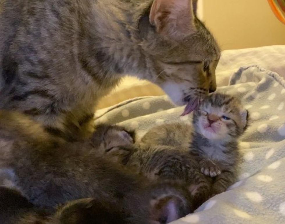 Soon after her arrival, the tabby cat, Aurora, went into labor. Her foster family was with her throughout the difficult delivery. Five of her kittens survived and began to thrive.