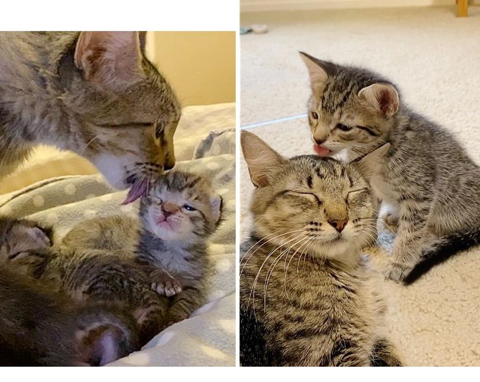 A cat was rescued just in time so her kittens could be born in a safe home. One of them was very clingy and insisted on being her little shadow.