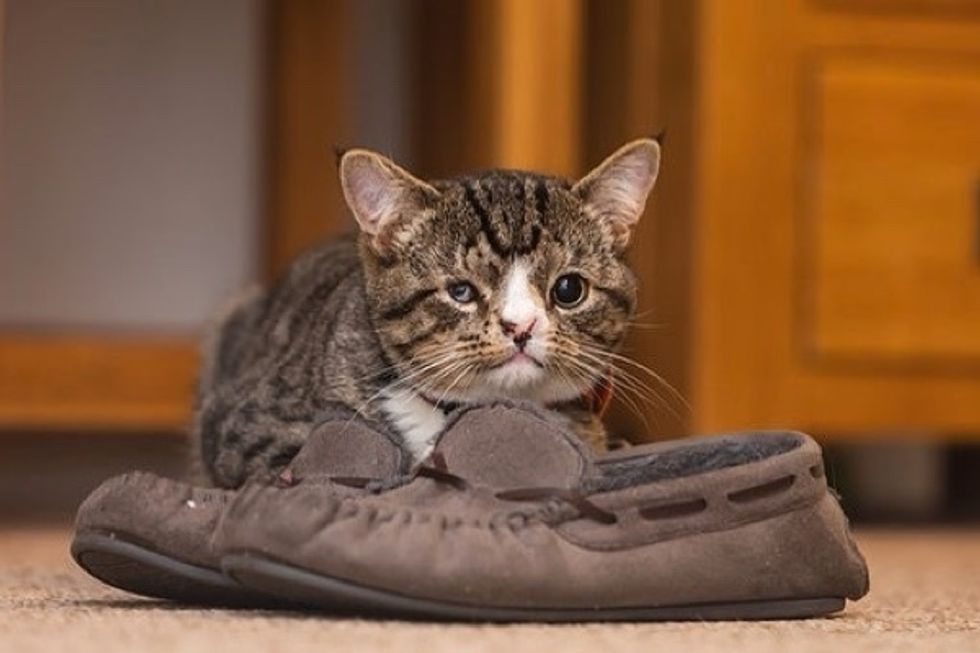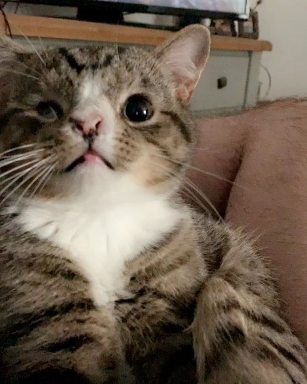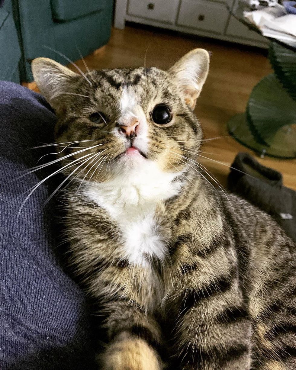 The kitty has hydrocephalus (a build-up of fluid in the brain), which gives him his misshapen head.