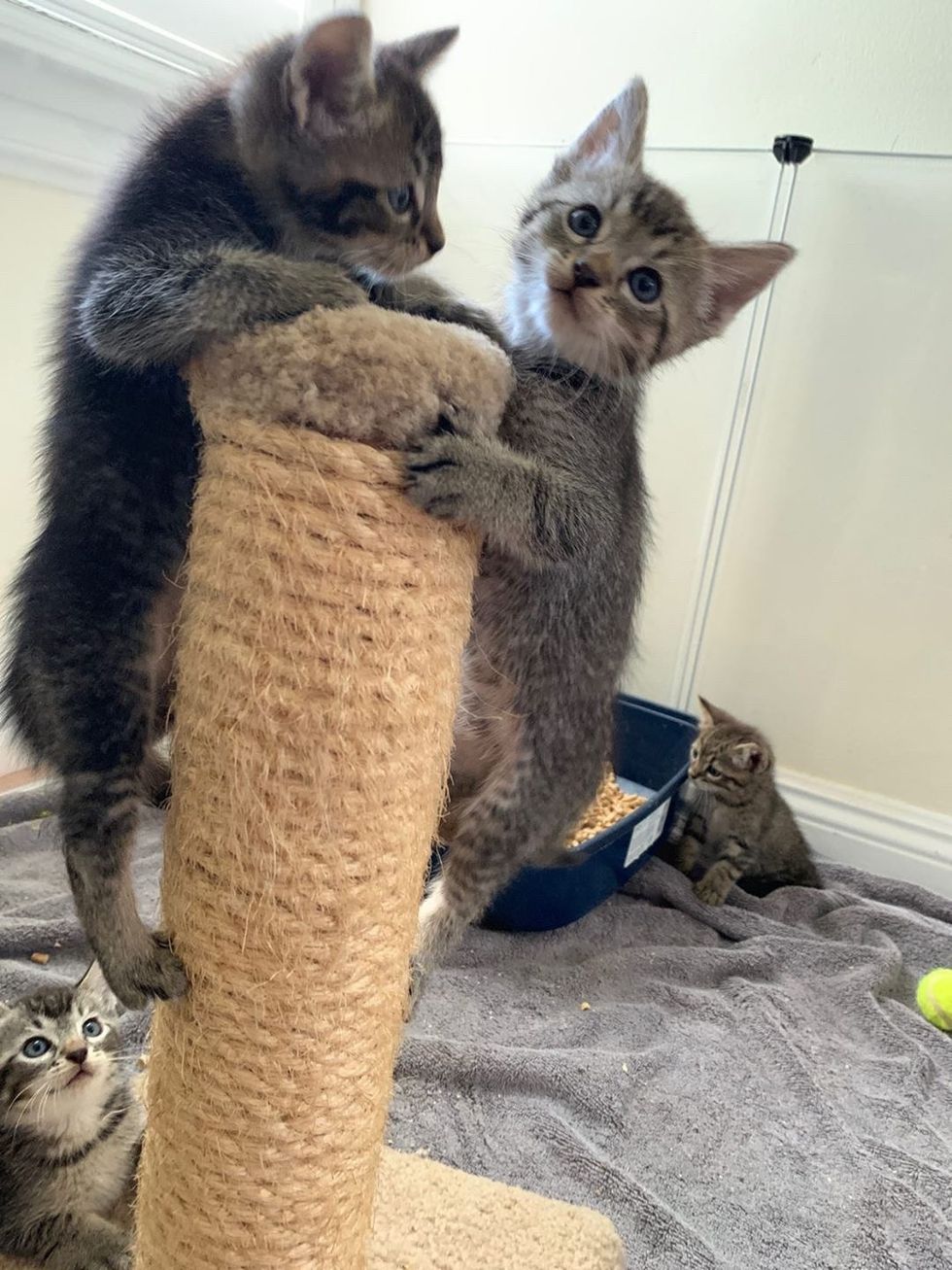 The kittens are getting more playful, confident and affectionate each day. When they are not chasing each other around, they are climbing things, enjoying their kitten-hood to the fullest.