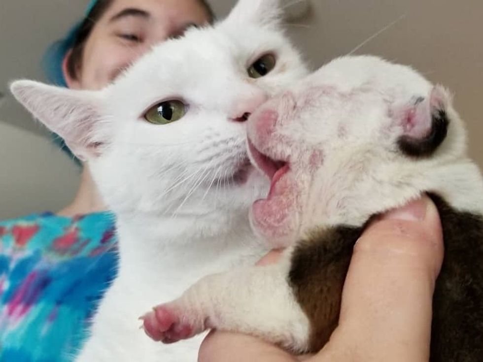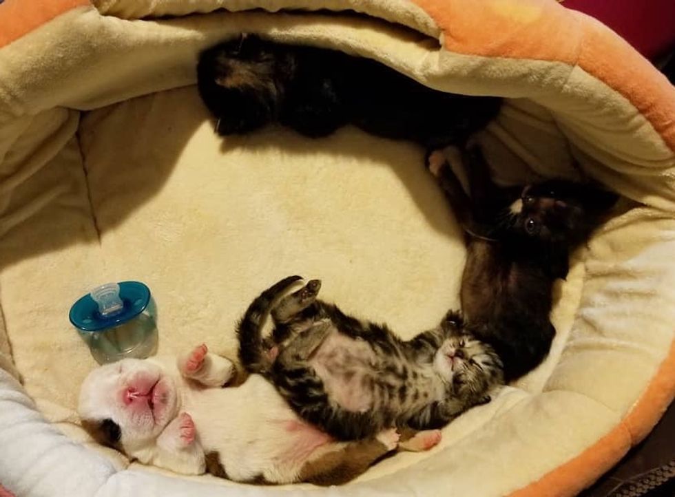A tiny orphaned puppy found comfort and love when he cuddled with kittens who are also orphans and met a nurturing cat at his foster home.