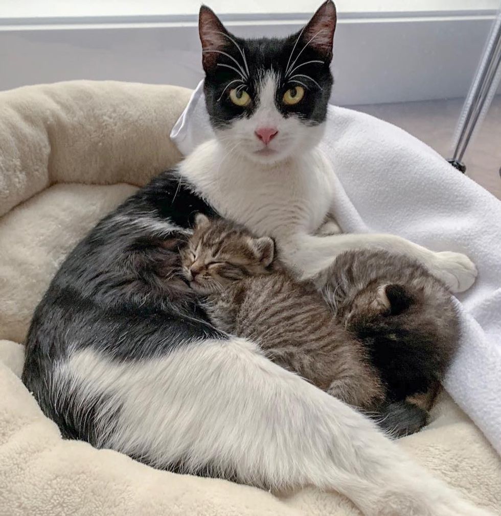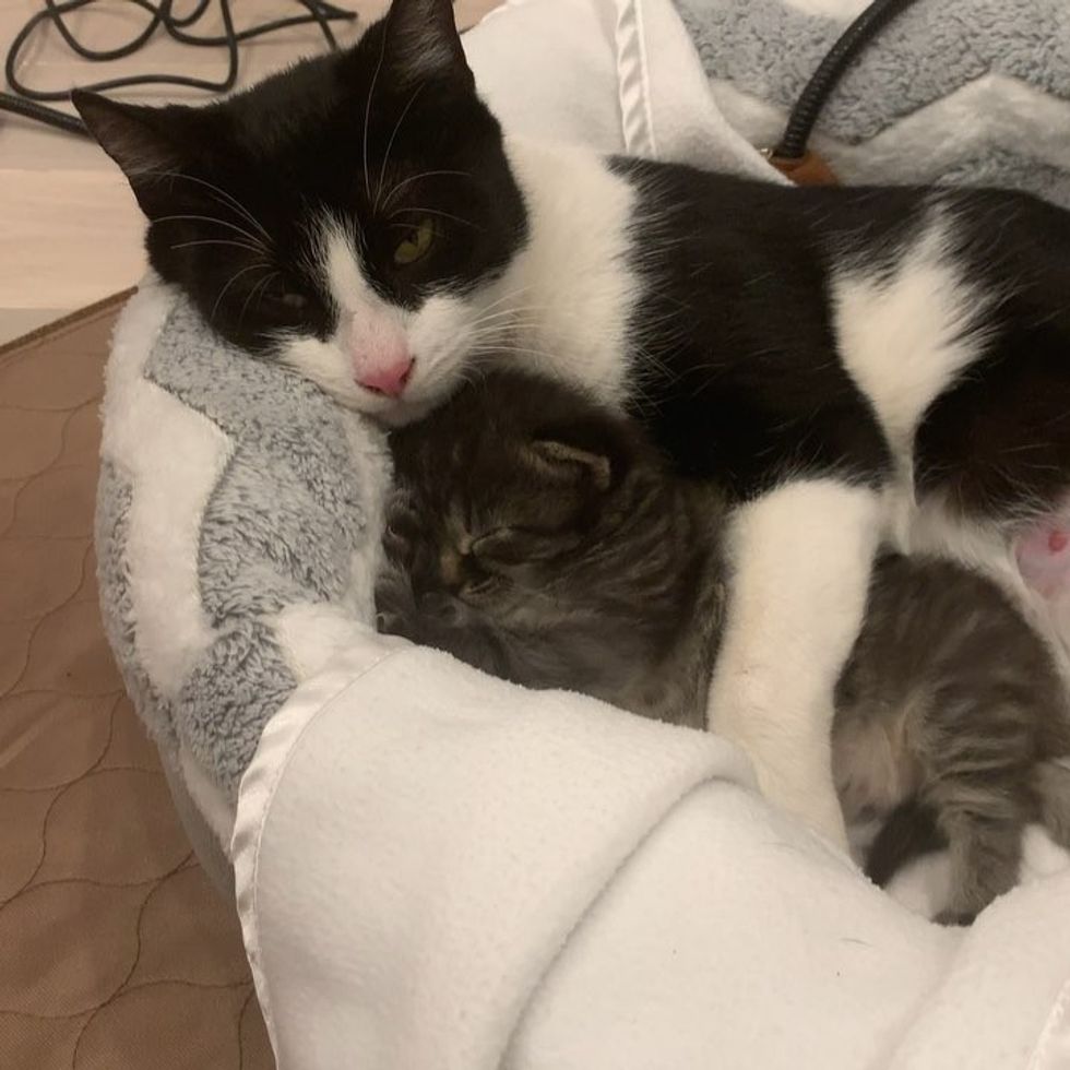 At first, they thought she was someone's cat because she was so friendly, but no one came forward to claim her. Turned out, the cat mom was a stray and had snuck her kittens into the basement to take shelter.