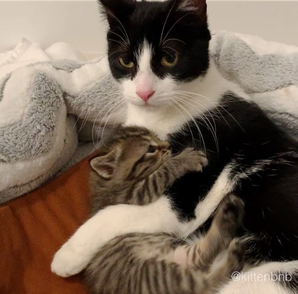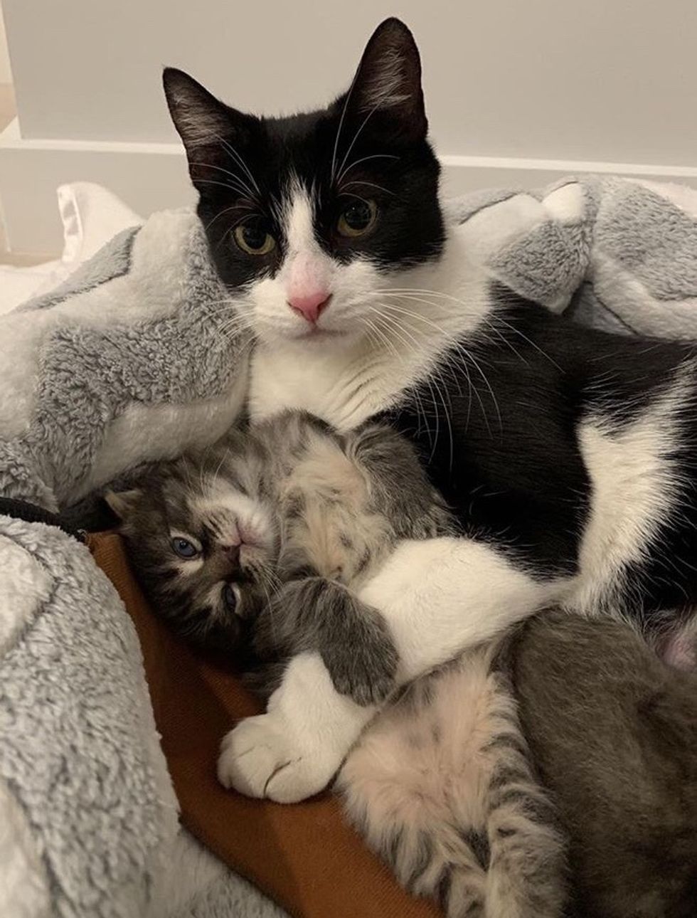 The sweet cat mom continues to love and care for her kittens and the newly adopted baby with help from her foster parents.