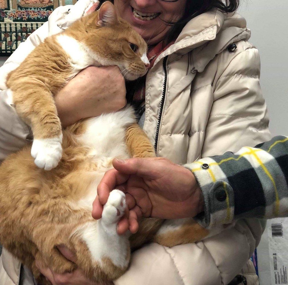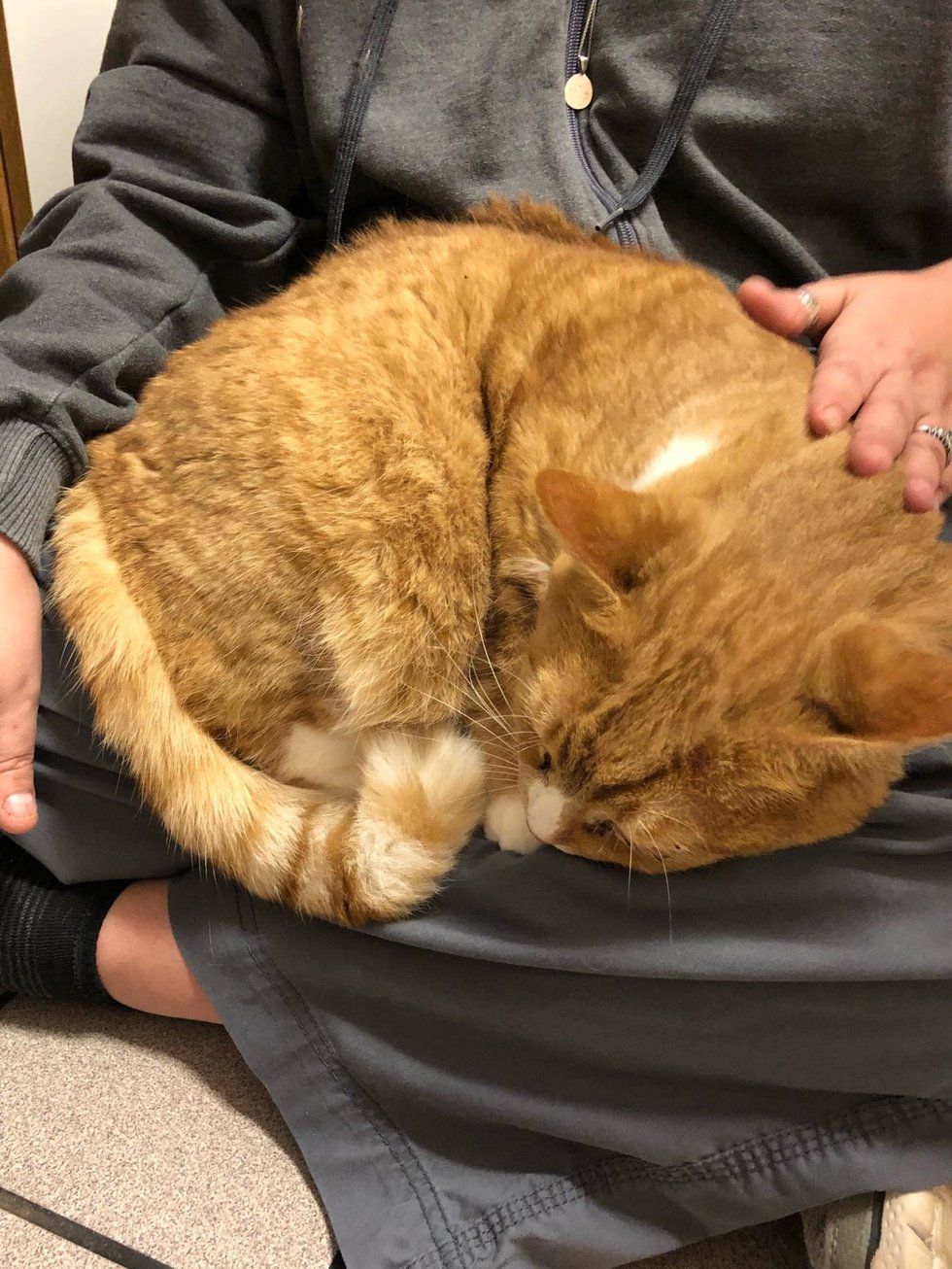 After a year, he was turned away and given up. The ginger boy was confused by the sudden change in surroundings, but as soon as he got to curl up in a warm lap, he started purring again.