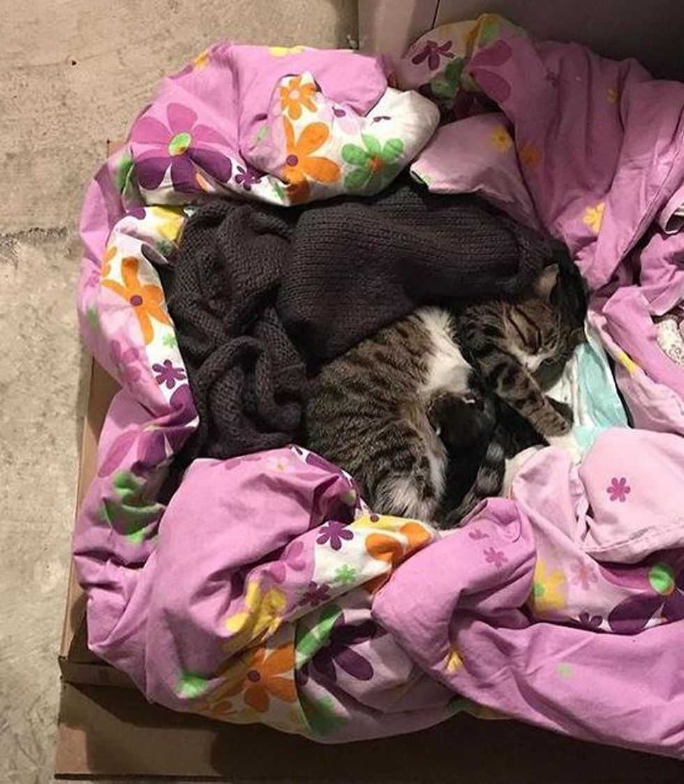 After wandering the streets for nearly three years, the tabby cat finally had a roof over her head along with her kittens. Ahsen who had several cats in her house, set up a comfortable nest for the little family in her garage.