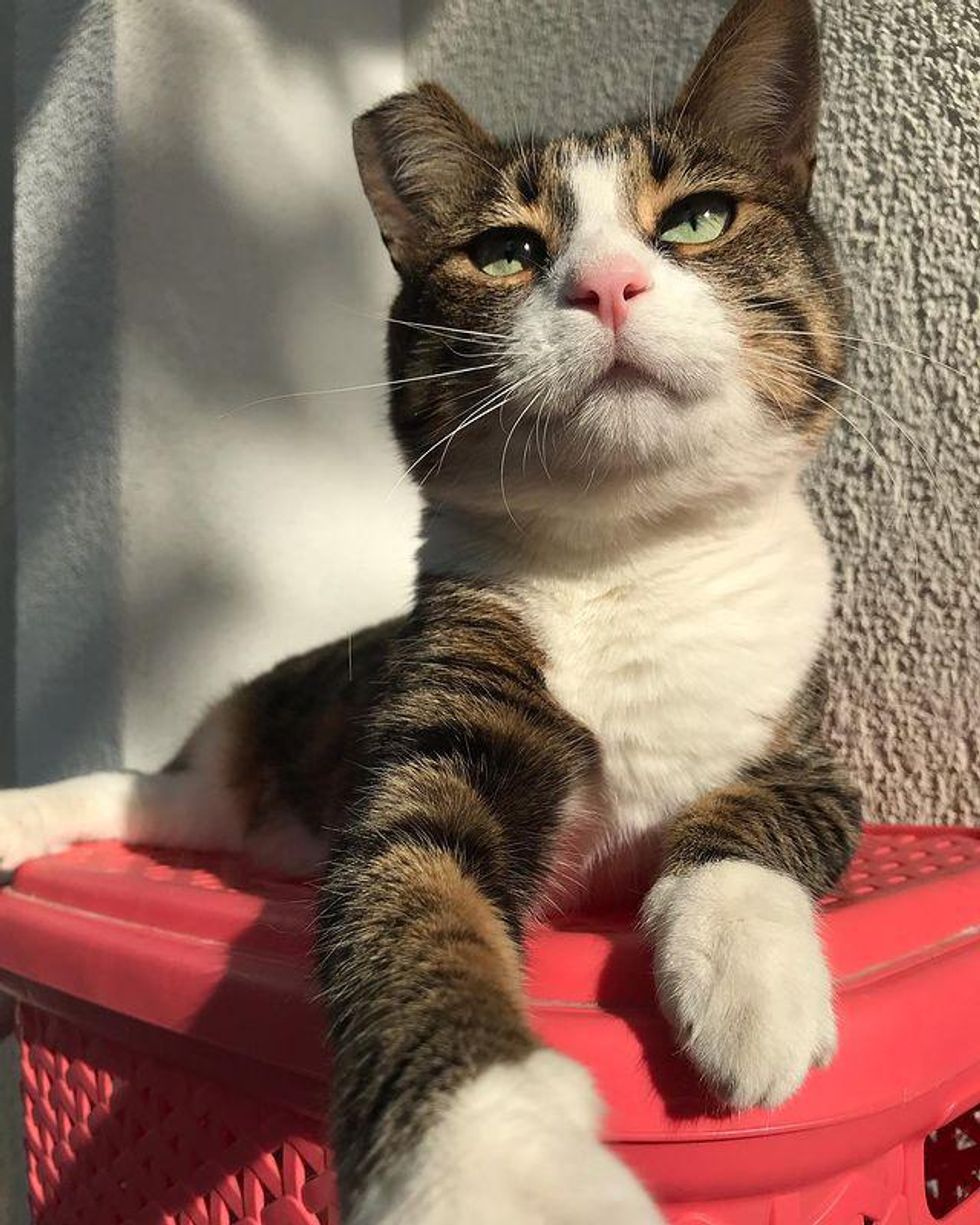 The former stray has blossomed into a beautiful tabby cat with quite the cattitude.