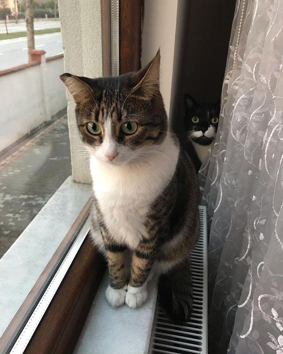 The tuxedo cat follows his sister from another mister everywhere around the house, as if he was Zümrüt's little admirer.
