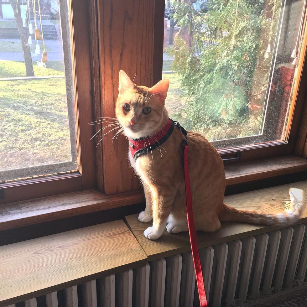 To avoid getting Max in messy places during construction, they would be taking walks with Max on a leash with a harness so the ginger boy would be able to see his friends and do what he loves.