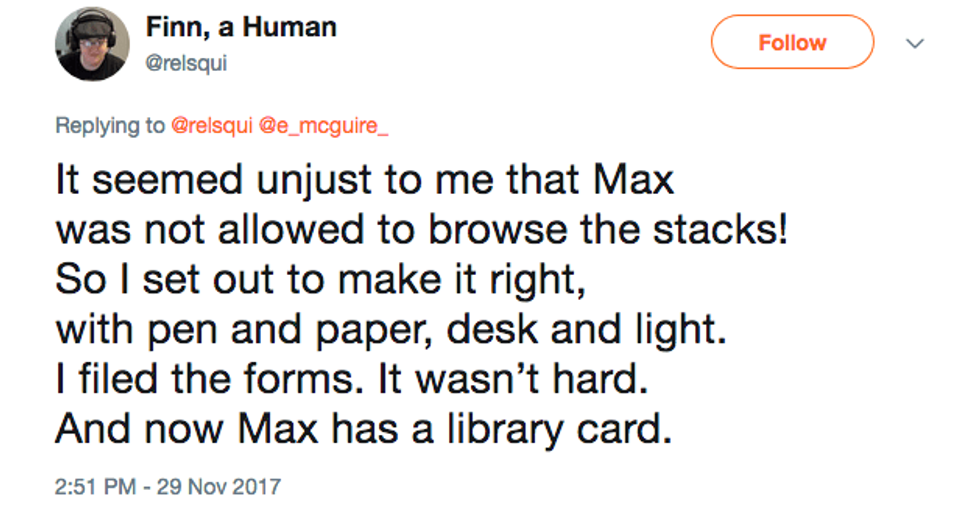 "Not only would I let Max in, I would have already had a miniature library card issued in his name and affixed to a fine collar," reddit user OhNoCosmo wrote.