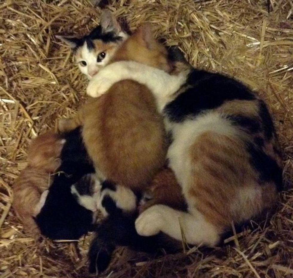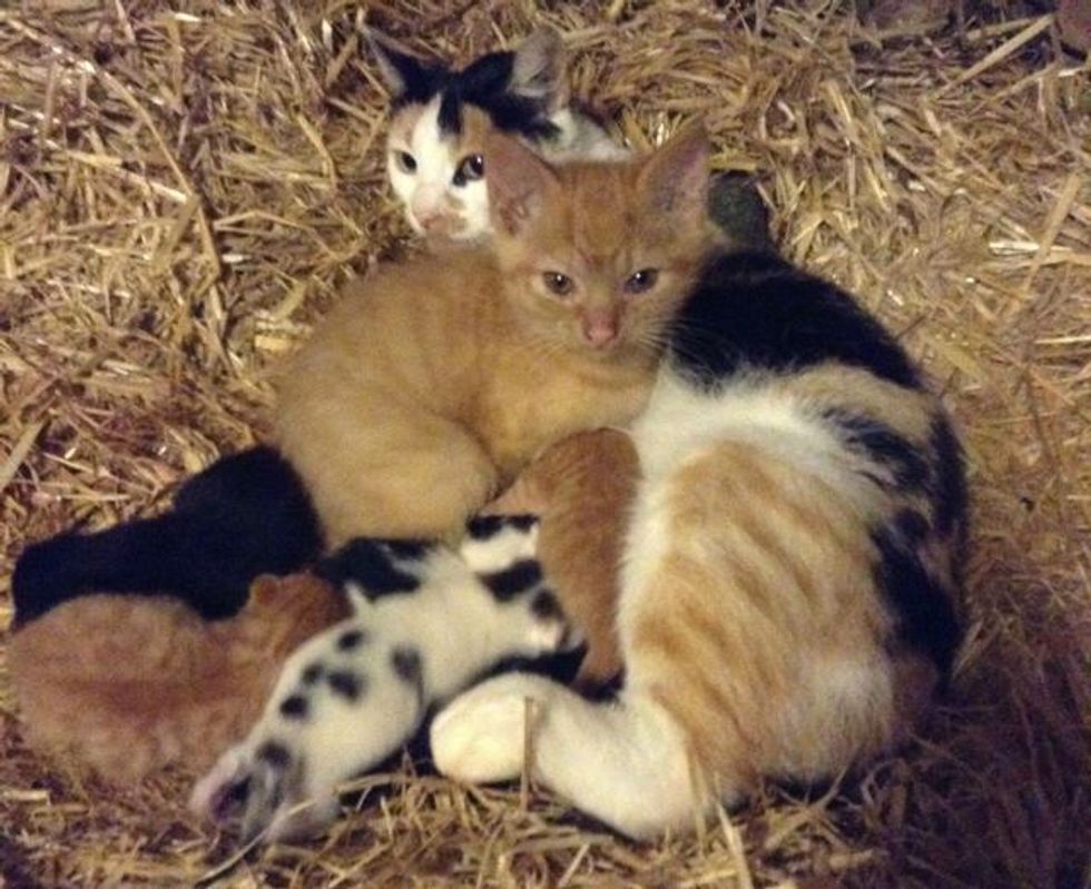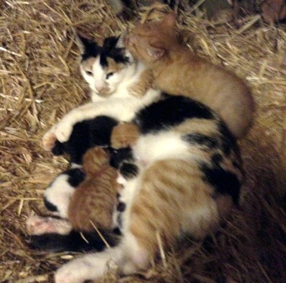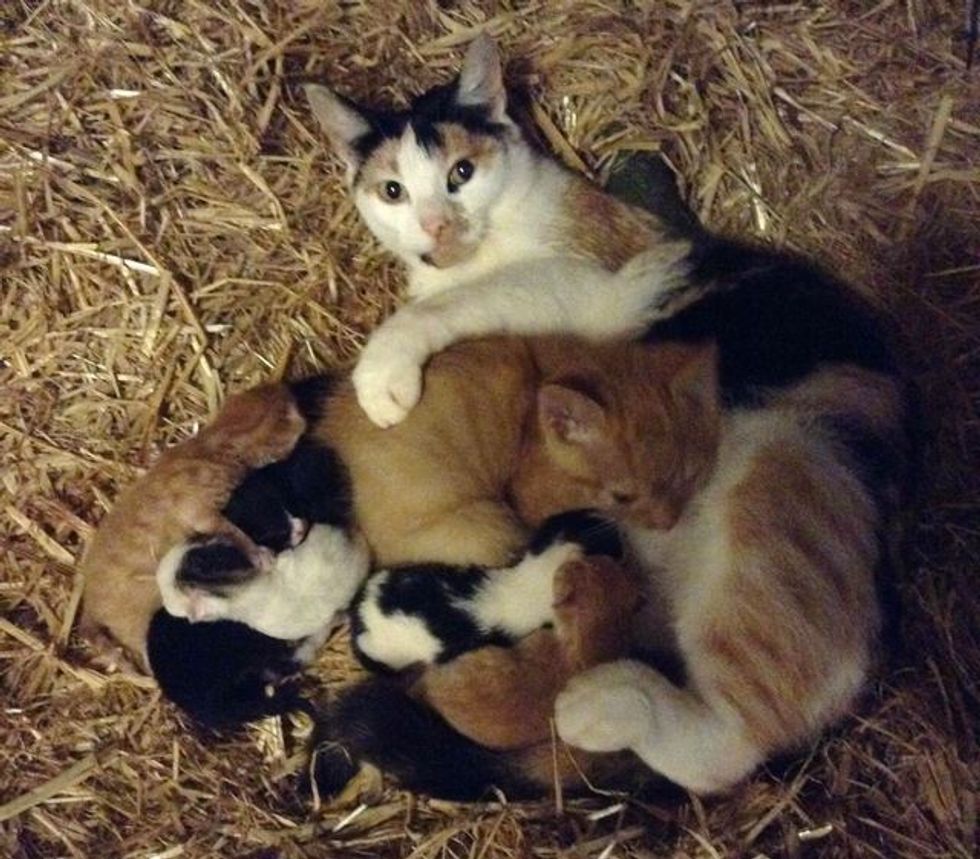 A farm cat mama adopted a big kitten who needed a lot of motherly love. She let him cuddle with her litter of kittens that were much smaller in size and even started nursing him as her own.