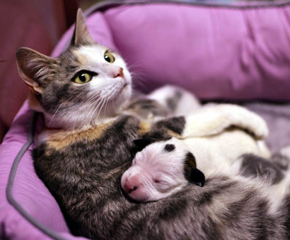 Lurlene the cat mama welcomes an orphaned week-old puppy into her family