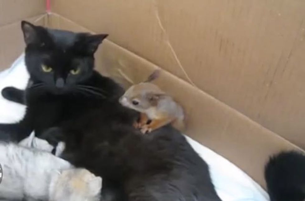 The cat mama took in the little squirrel and set it up at the milk bar to nurse along with its new feline siblings, but the squirrel wanted to play some more.