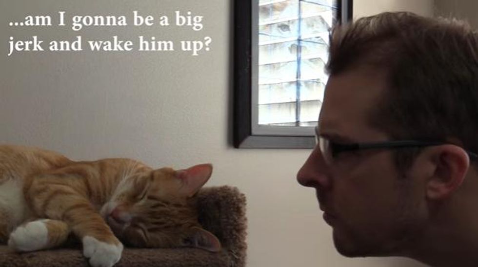 He crept up on his sleeping cat and meowed loudly in his ears as revenge for his lost sleep. The poor ginger cat was startled by the man's actions. :(