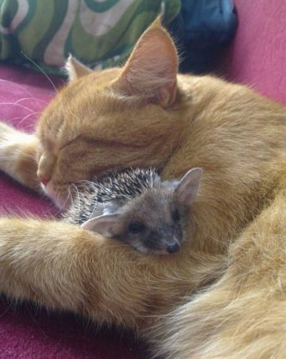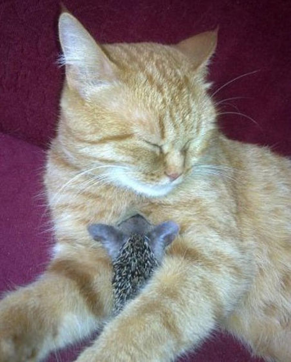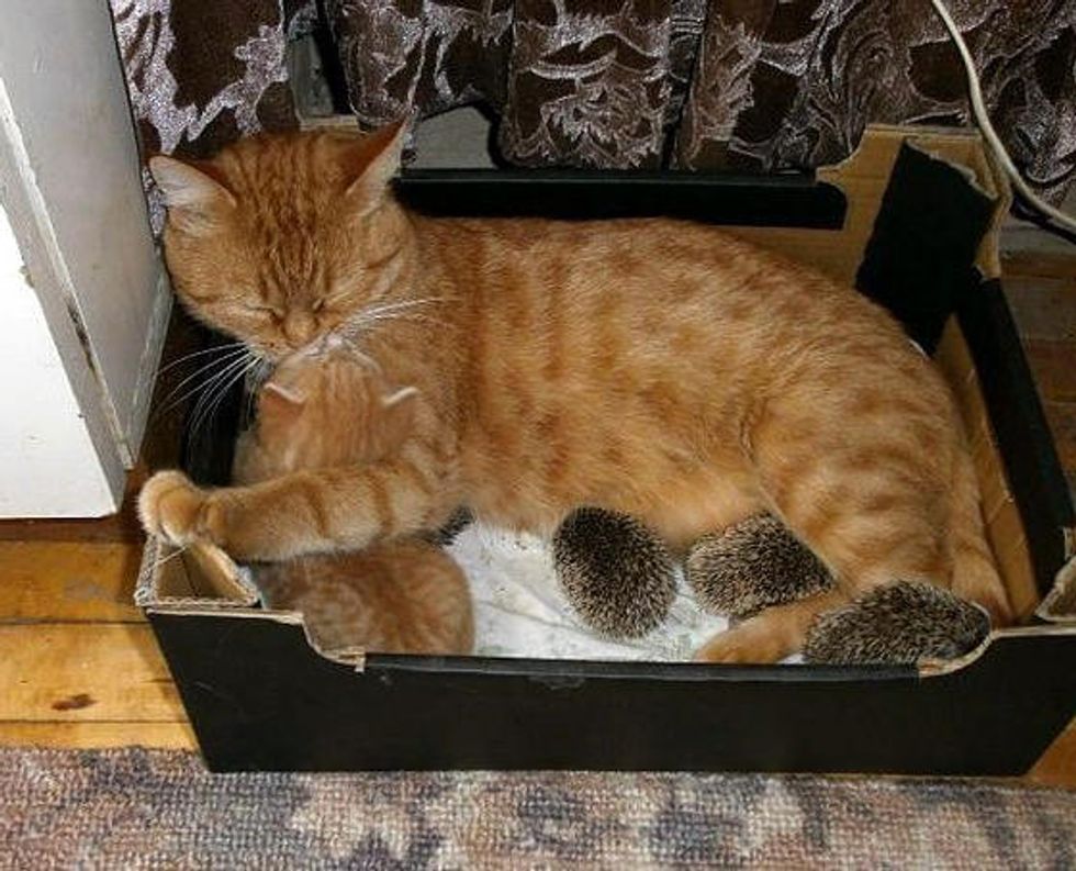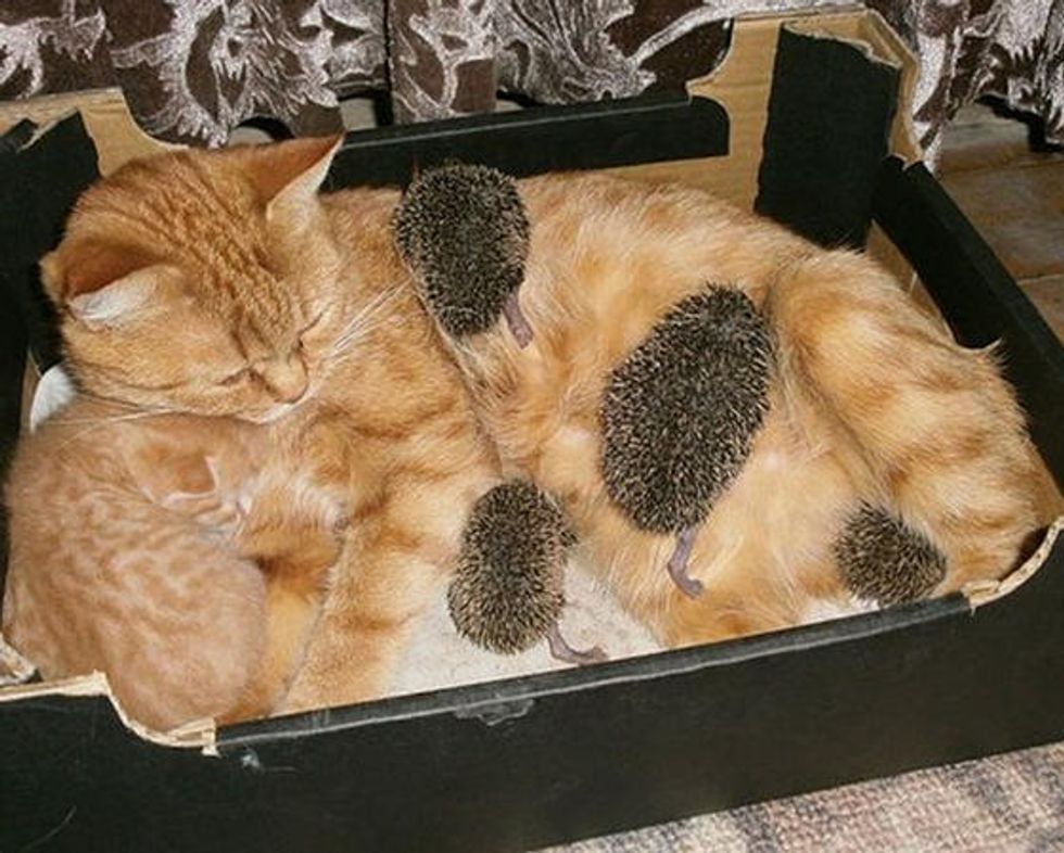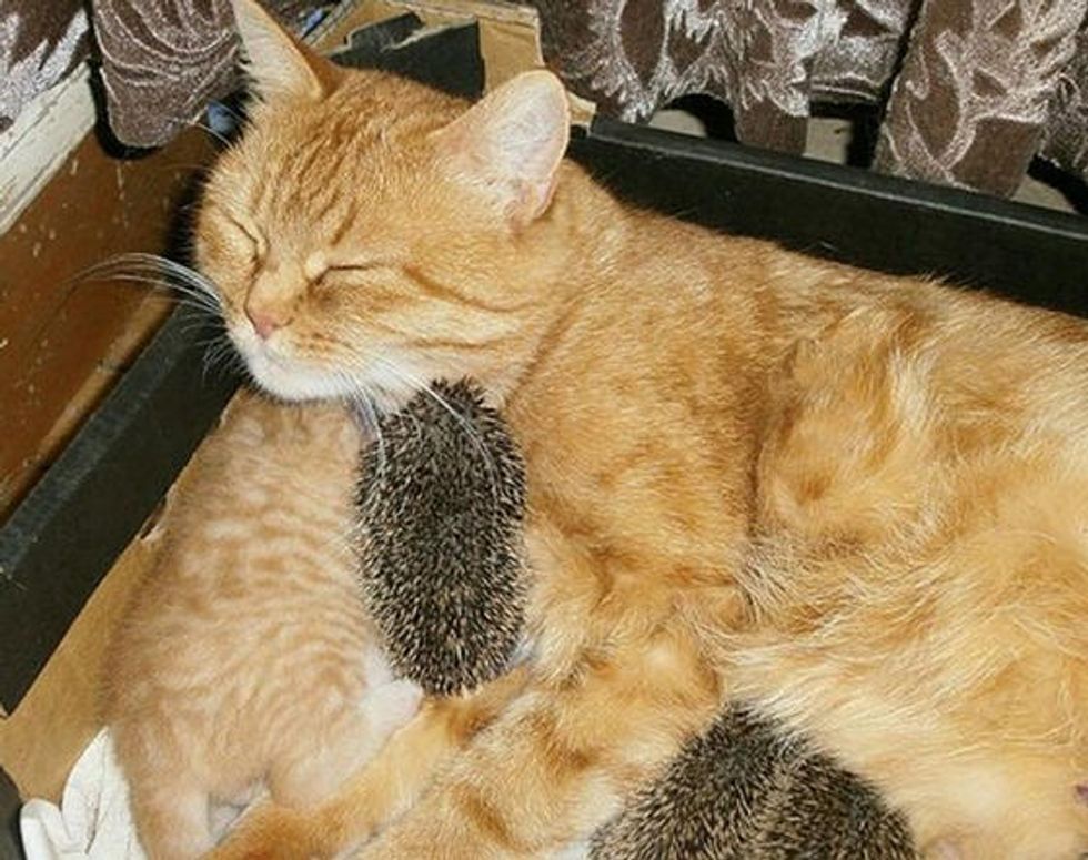 A ginger mother cat , Sonya, took in a litter of prickly orphan critters. Four orphaned hedgehog babies found their new mom after they lost their own. The cat mama started nursing them alongside her own kitten when they were introduced to her. Her motherly instinct kicked in and she adopted them as her own.