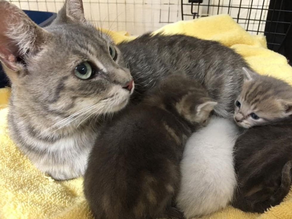 A mother cat was so glad to be reunited with her kittens in a safe place after trying to keep them from harms way in the basement of an old home.