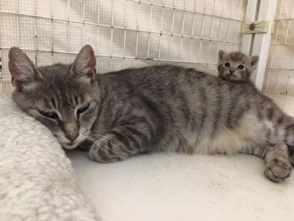 When they arrived at the shelter with the cat mom in a cage, they slowly introduced her babies back to her.