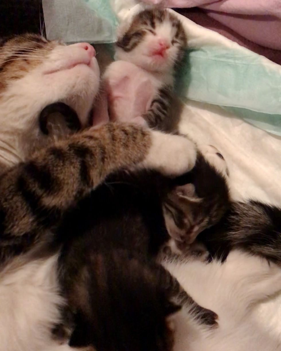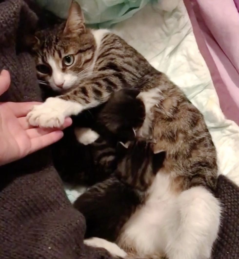 The mama cat lay down on her new bed covered in warm blankets and immediately started nursing and caring for her kittens.