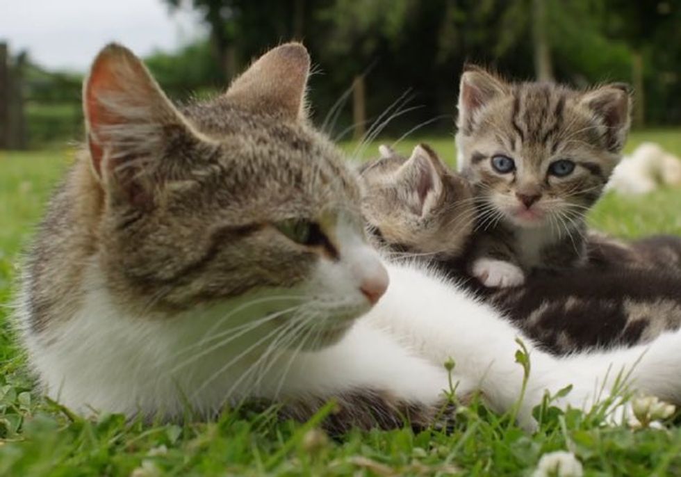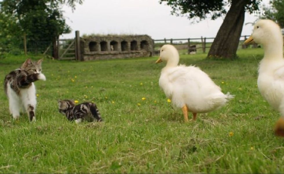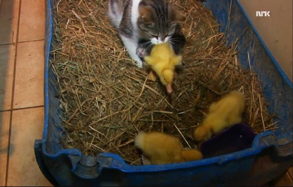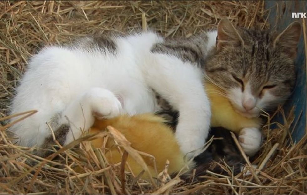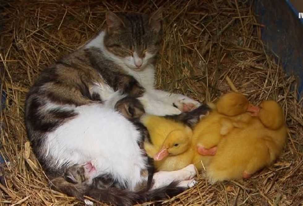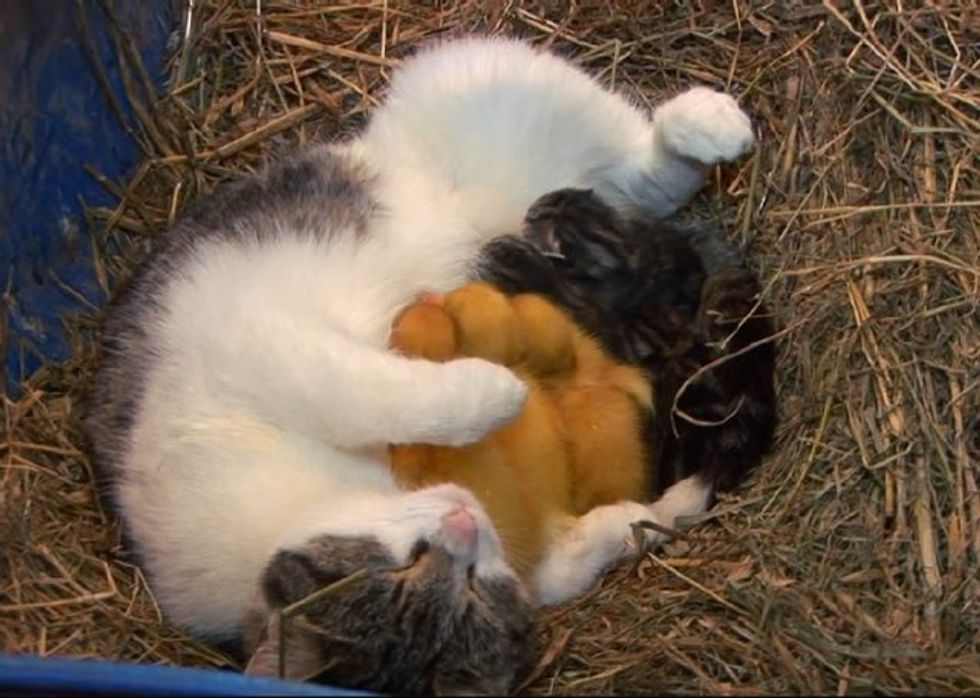 Meet Della the cat who lives in a farm in Ireland. When she had a litter of kittens, she also adopted three unusual babies.