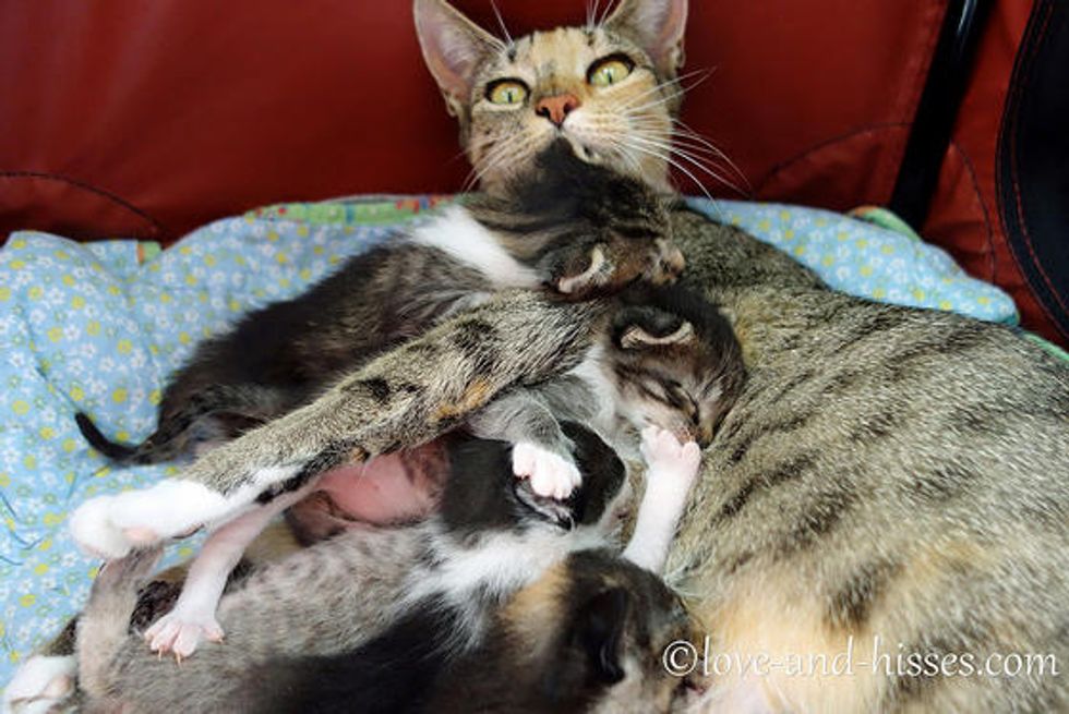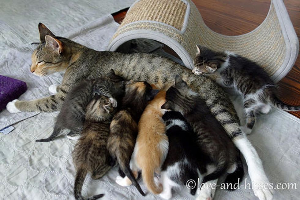 This lovely feral cat went into labor and gave birth to nine babies when they found her. Seven of the kittens thrived.