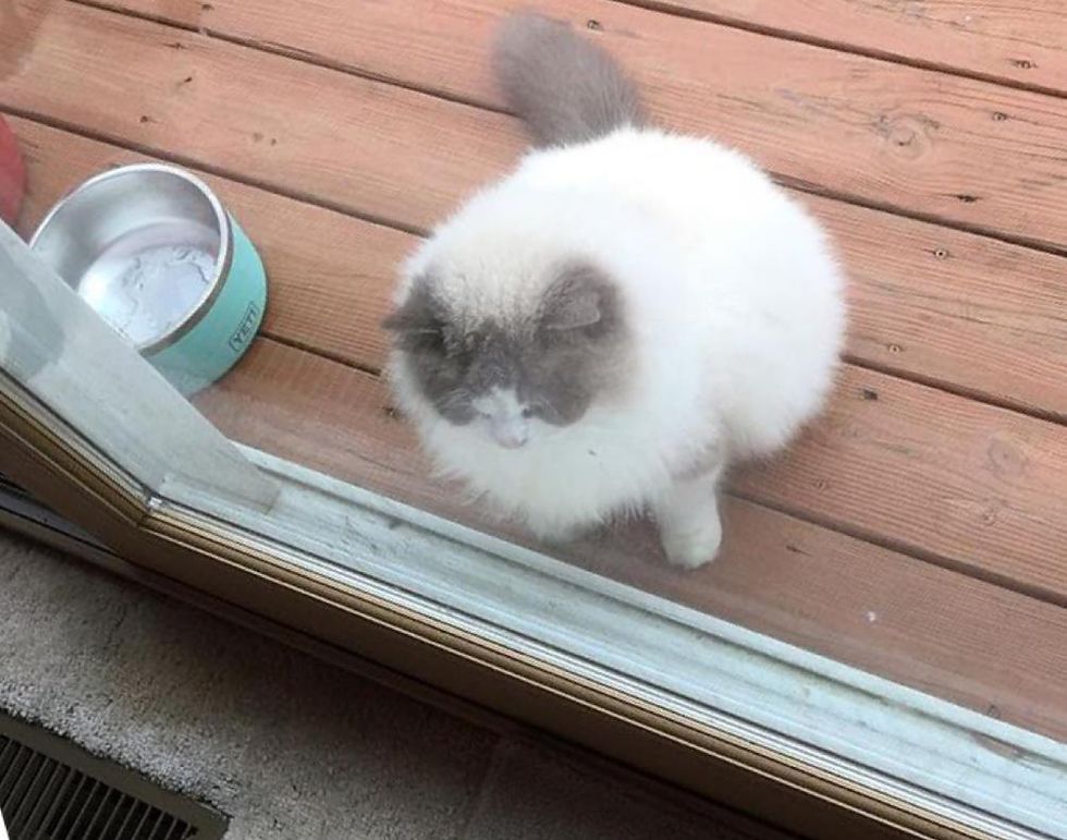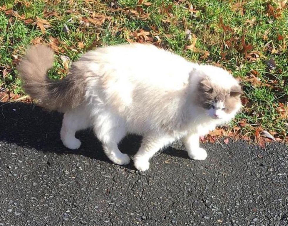 The fluffy cat was locked out of the house that he'd known all his life, and wandered to neighbors' homes down the street. His original family moved away and left him behind.