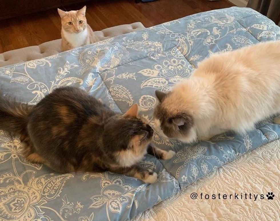 Debbie introduced the friendly feline to her resident cats Jojo and Lil Man. After getting through their awkward getting-to-know each other phase, they started to hang out a bit more, but Jojo the calico insisted on calling all the shots.