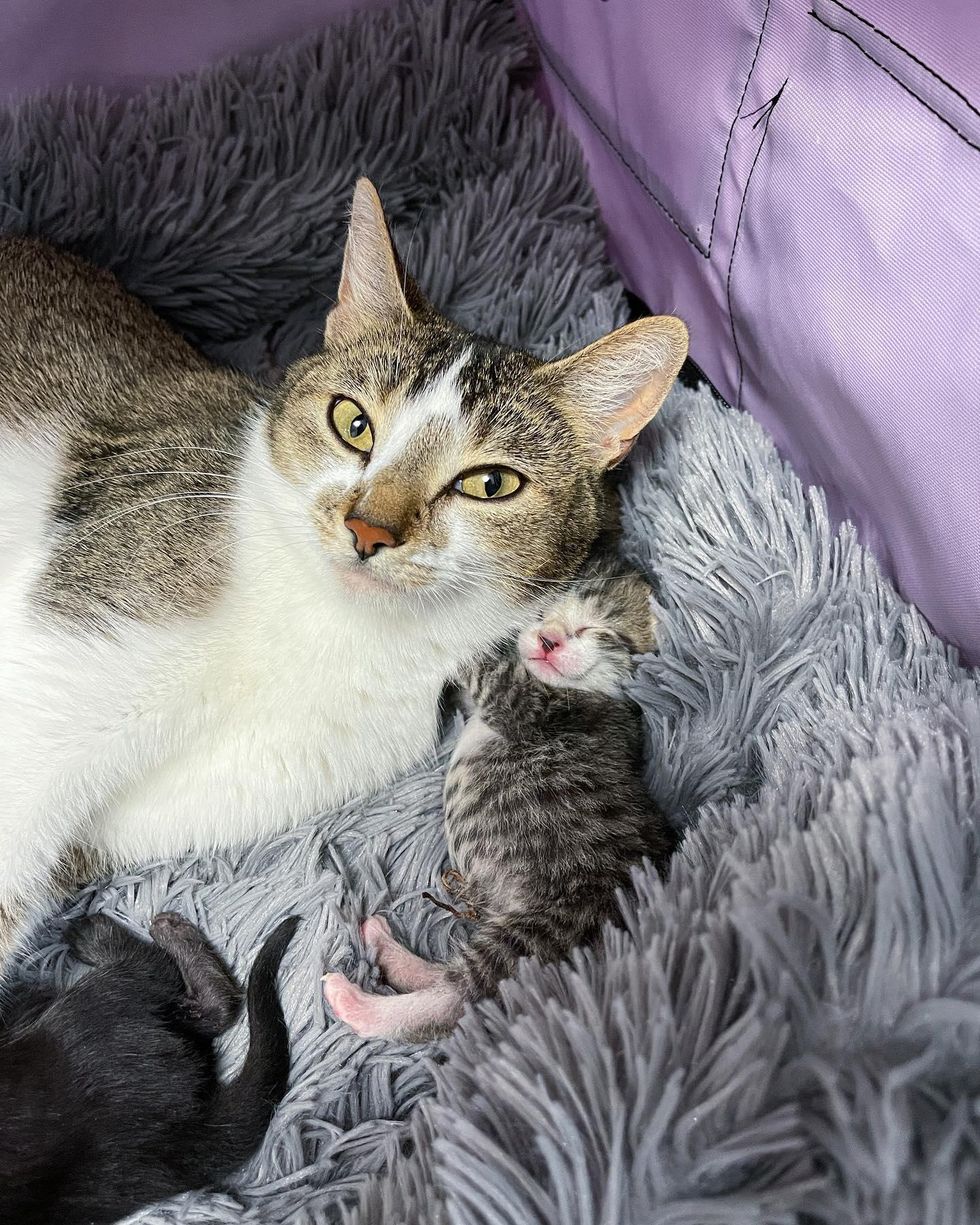 When she came back and appeared to be pregnant again, the kind neighbor made it their mission to get her into a safe place. They reached out to Mellissa, founder of Tiny But Mighty Kitten Rescue, and got the expectant mom into foster care.
