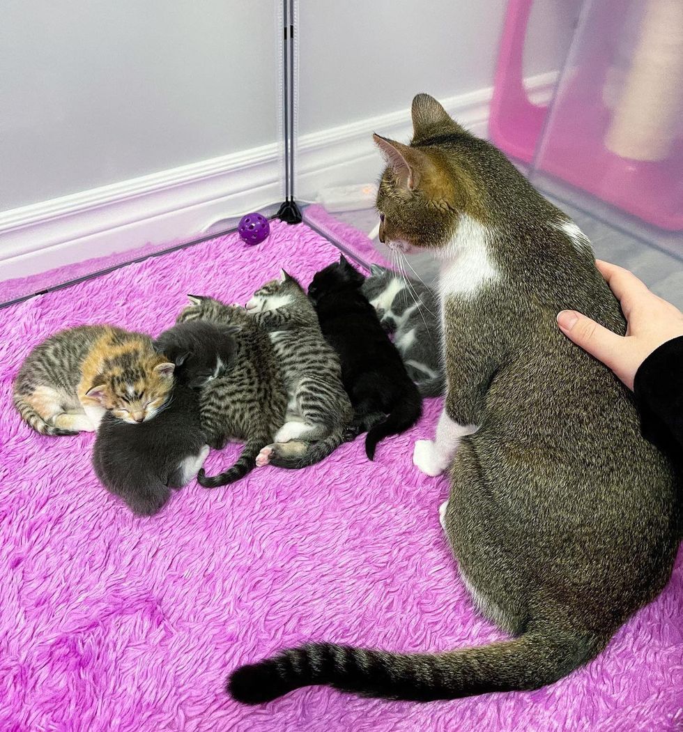 A few weeks later, Hazel gave birth to six healthy kittens in the comfort of a warm nest. She dove right into mommy duties, nursing her tiny hazelnuts while purring and making biscuits (kneading).
