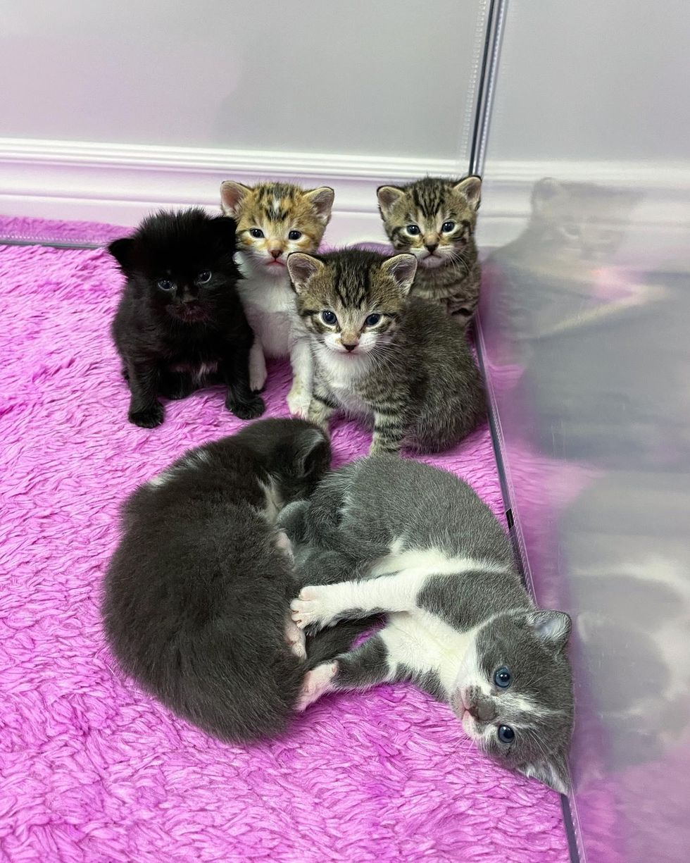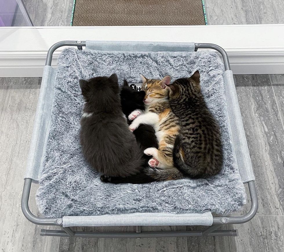 At five weeks old now, the kittens are thriving along with their doting cat mom. Whenever they receive a new toy or bed, they enthusiastically try to put it to good use.