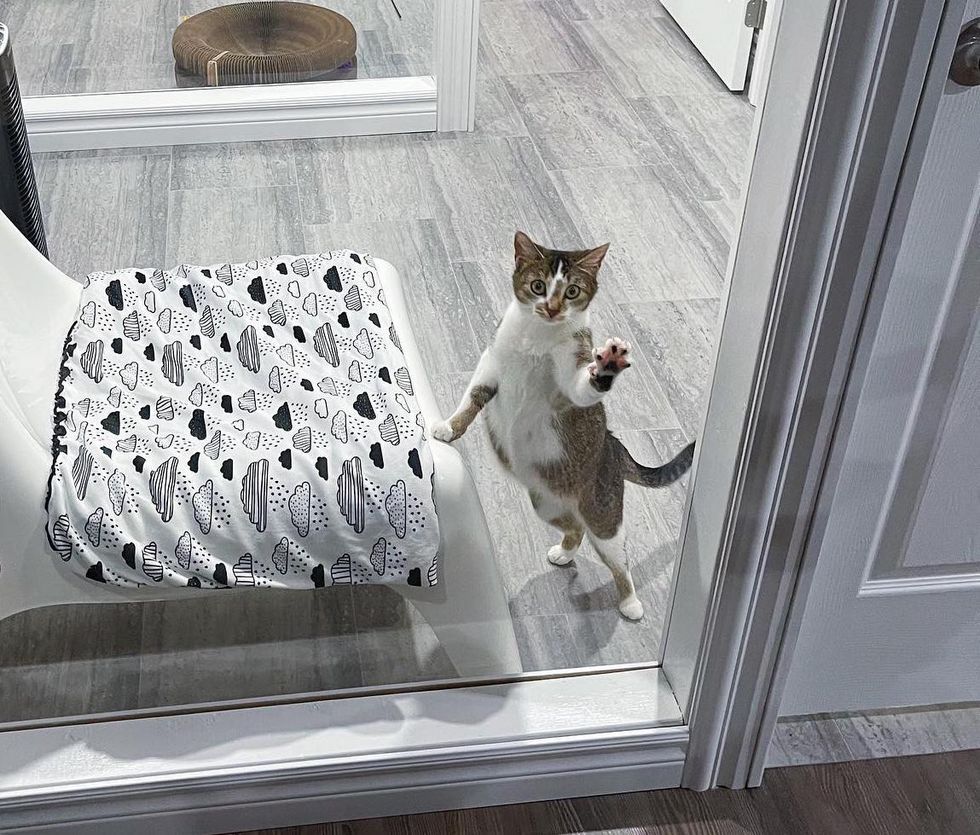 A family from Ontario, Canada was greeted by a cat in their yard one day. They gave her some food and she just kept coming back. The friendly feline became a frequent visitor, digging and "dancing" along the screen door to get attention when she was hungry.
